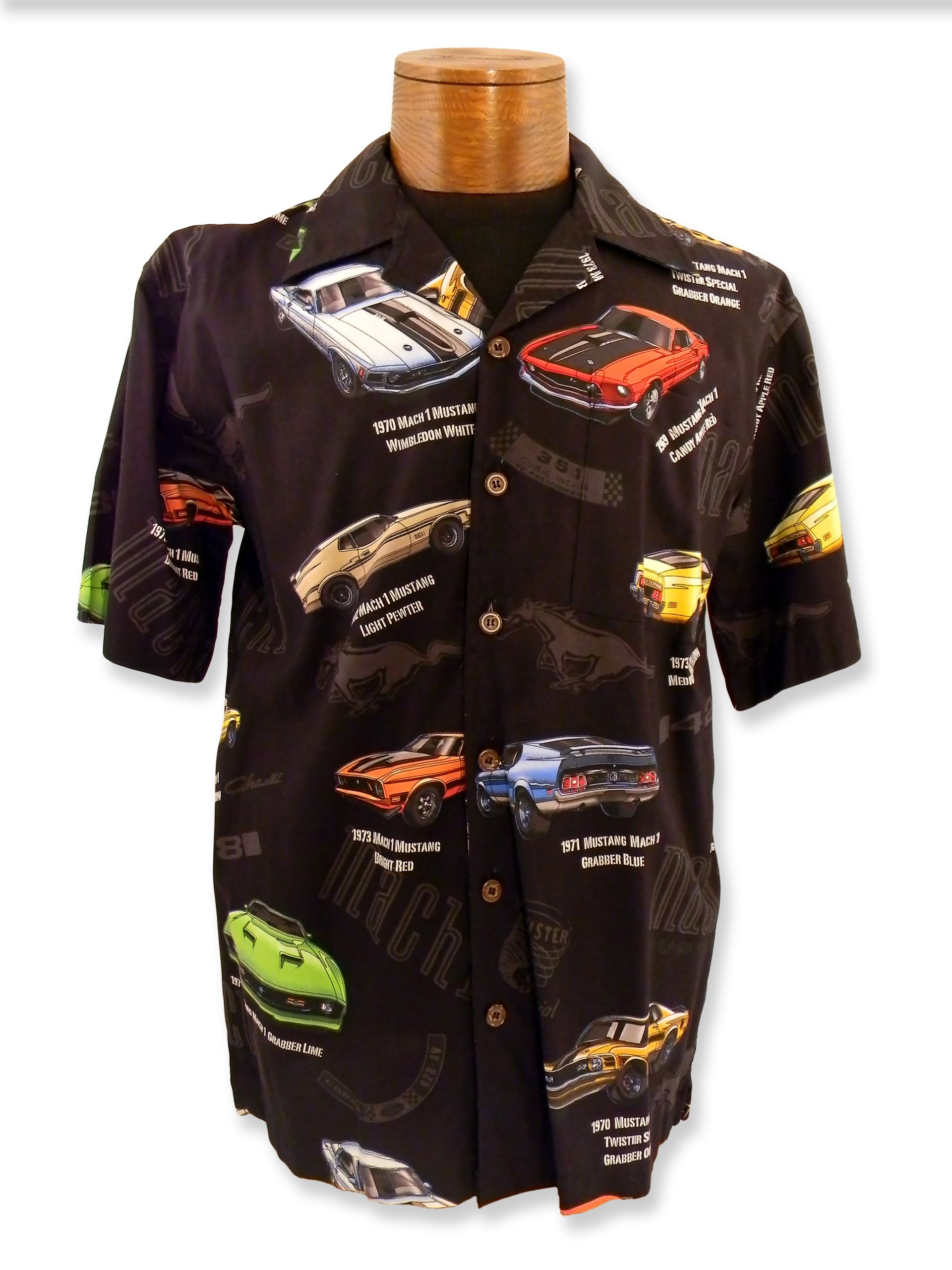 Mach 1 cars and logos printed all over on a black background camp shirt.